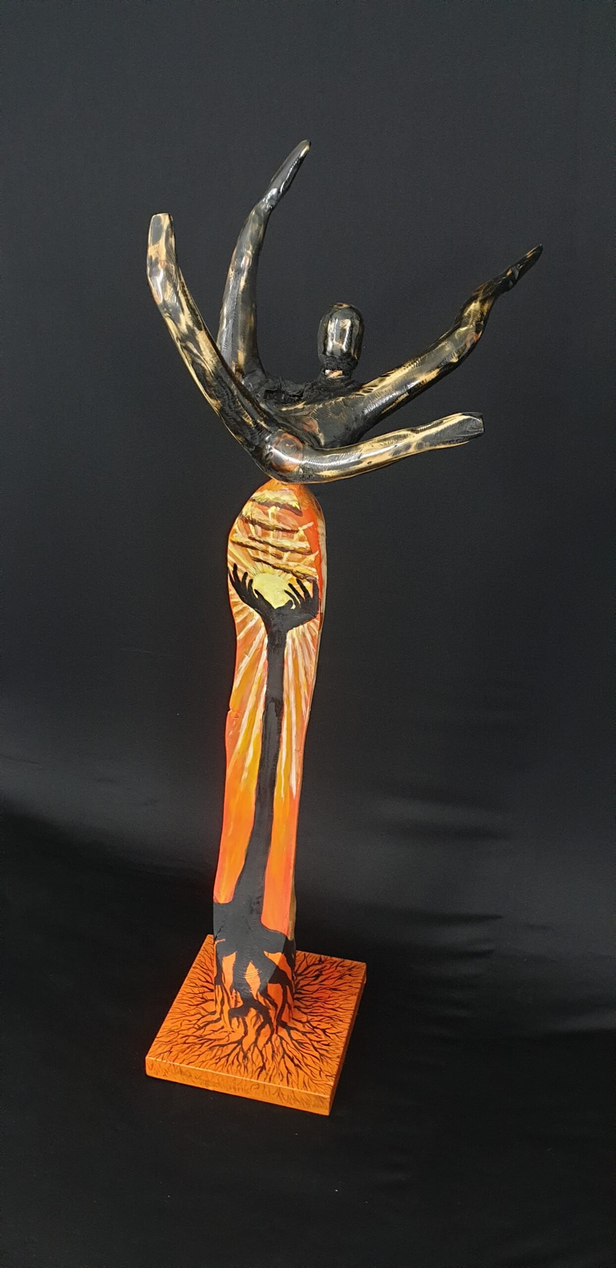 Ein hölzernes Meisterwerk aus Lärchnholz, in Form einer von oben fallenden Person, und in der Mitte ist eine Zeichnung von zwei Händen, einer Sonne und einem Baum, Acrylfarben, das Meisterwerk ist oben schwarz gefärbt und mit Lack überzogen, Die Höhe beträgt 130 cm, die Breite von der Mitte beträgt 13 cm und von der Oberseite 34 cm, die Basis ist aus Holz, quadratische Form, Länge Seite 28 cm,