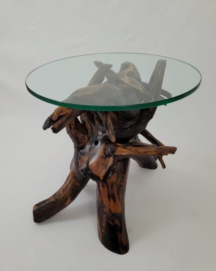 A small table made of tree root wood, with a circular glass top, diameter 40 cm, table height 40 cm, width 43 cm, varnish coated.