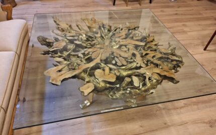 A table made of tree roots wood, painted in gold, with a golden metal base, in the middle of which is a circular piece of glass with a diameter of 36 cm, and on the surface of the table is a square piece of glass of equal length and width of 160 cm.