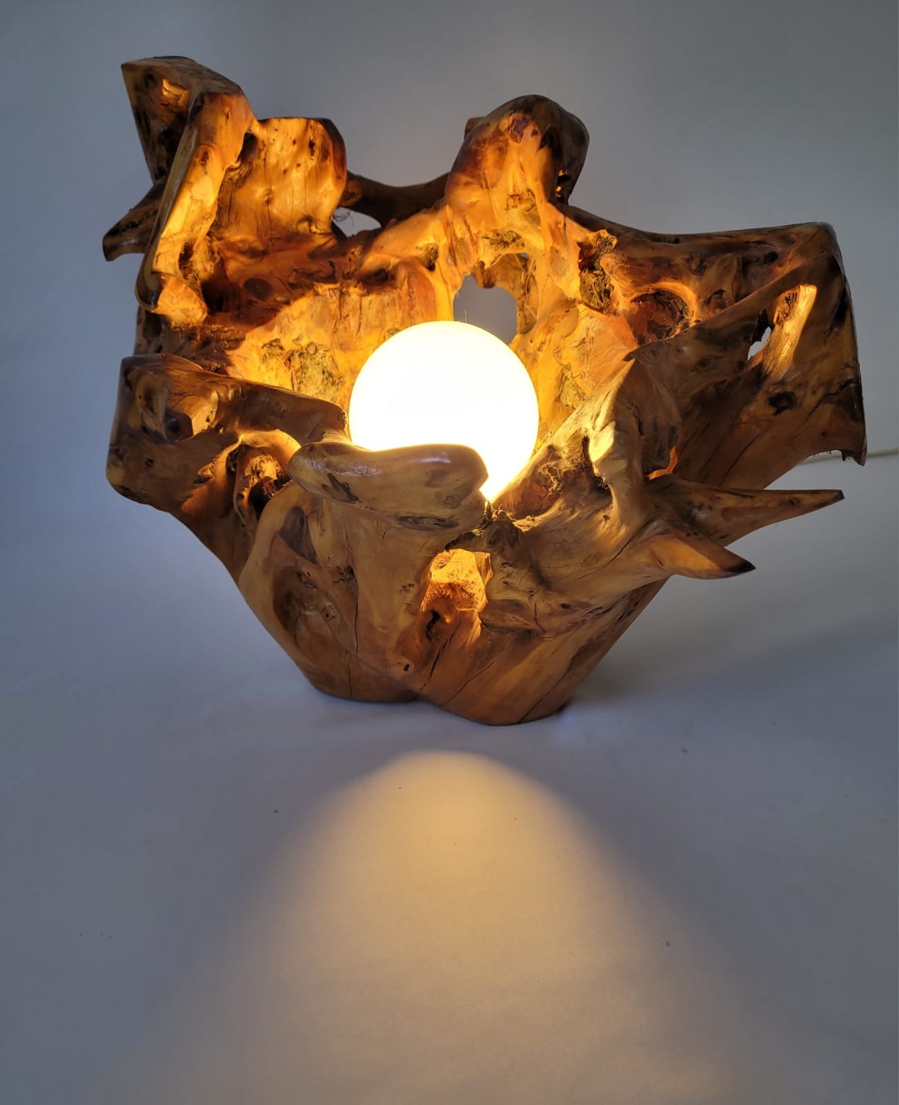 A lamp made of wood from tree roots, coated with varnish, in the middle of which there is a white luminous lamp ball with a diameter of 10 cm, the width of the lamp is 38 cm, the height is 30 cm.