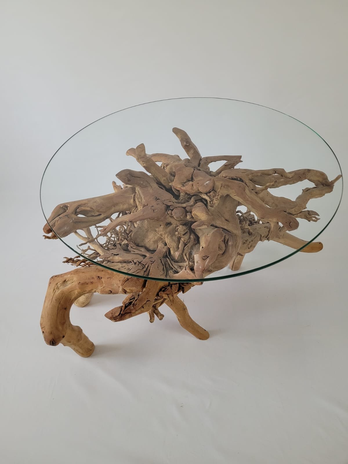 Table made of tree roots, with a glass top, diameter 40 cm, table height 46 cm, length 60 cm.