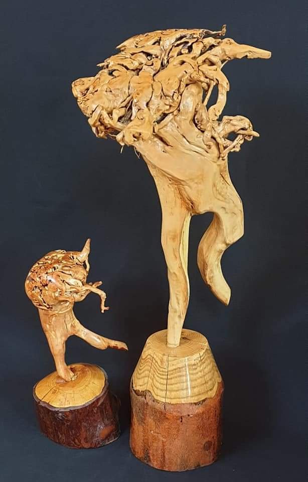 Two masterpieces made of wood from tree roots, painted with varnish. The small size: height 55 cm, width 23 cm, and the large size: height 100 cm, width 36 cm. The two masterpieces are sold together.